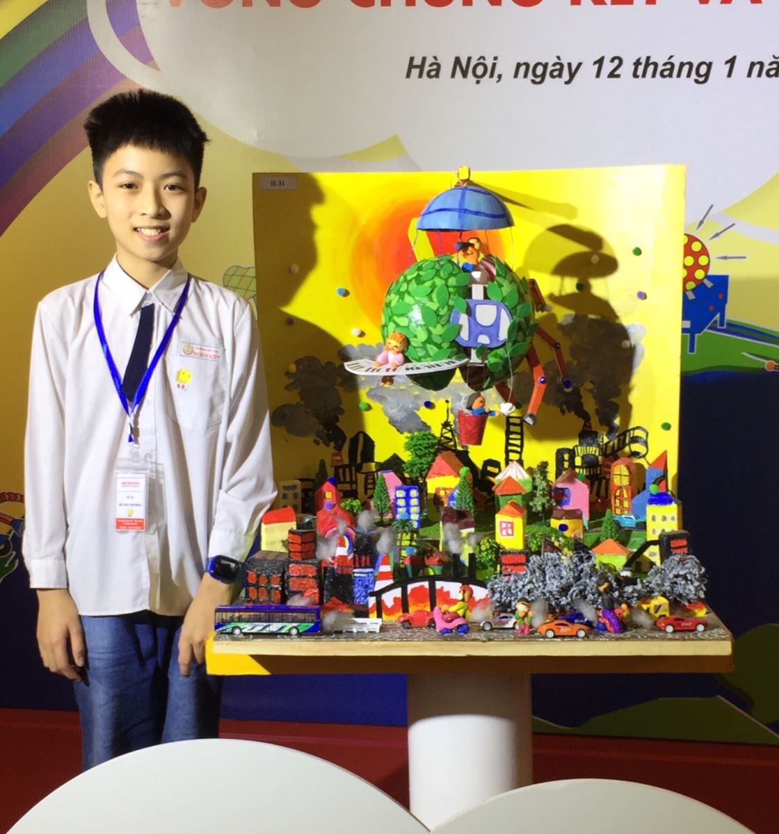 !important; Hiện nay, tình trạng ô nhiễm đang ngày càng gia tăng tại các đô thị lớn như Hà Nội, TP Hồ Chí Minh làm cho người già và trẻ em mắc nhiều bệnh về đường hô hấp. Chính vì điều đó đã nảy ra ý tưởng trong tâm hồn trẻ thơ của em Bùi Đức Tuệ Nhân là tạo ra máy bắn hạt cân bằng không khí. Chiếc máy hoạt động nhờ sức gió và ánh sáng mặt trời. Với ý tưởng này em mong bầu không khí của nước ta và các nước khác trên thế giới sẽ luôn luôn được trong lành. Người già và trẻ nhỏ sẽ không mắc các bệnh về đường hô hấp. Mô hình sáng tạo của em cho thấy màng bọc lá cây sẽ hút bụi mịn qua những ô cửa hình lá rồi qua tấm lọc thành hạt cân bằng không khí. Được các cánh tay rô - bốt bắn ra ngoài không trung, hạt cân bằng sẽ tự mở ra, đẩy khí ô – xi ra ngoài và hút không khí bẩn để tiếp tục làm sạch không khí. Lăng kính xanh như tấm pin nóng mặt trời, hút ánh sáng để tạo ra điện cho bộ điều khiển. Cánh quạt vừa lọc a xít trong các đám mây, vừa tạo ra điện cho cánh tay rô – bốt.