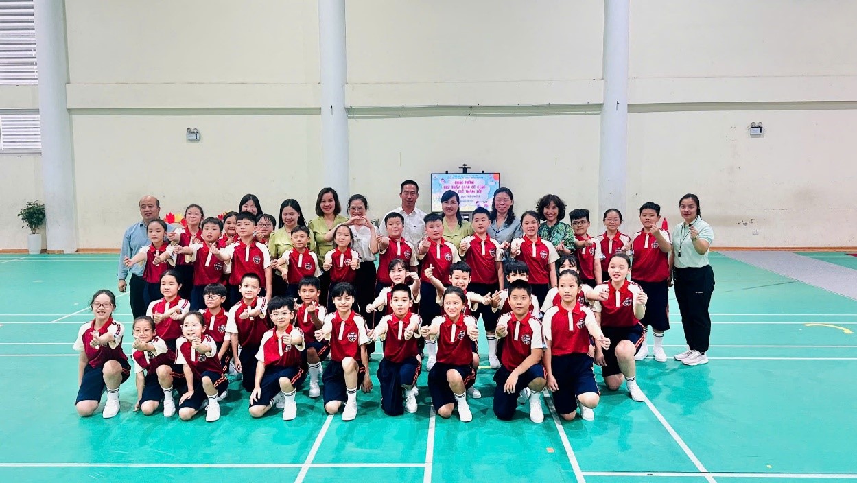 Đồng chí Nguyễn Vân Anh chụp ảnh lưu niệm cùng đại diện Phòng giáo dục và Ban giám hiệu nhà trường trong buổi dạy chuyên đề cấp Quận