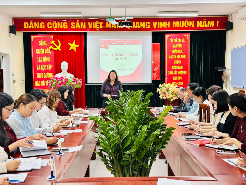 Tại cuộc họp, Chi bộ đã đánh giá kết quả thực hiện nhiệm vụ tháng trước, trong đó nổi bật là việc duy trì nền nếp chuyên môn, thực hiện nghiêm kế hoạch của ngành và đơn vị, đẩy mạnh đổi mới phương pháp dạy học, ứng dụng công nghệ thông tin và triển khai tốt các phong trào, hoạt động đoàn thể trong tháng 11, triển khai trọng tâm công tác tháng 12.