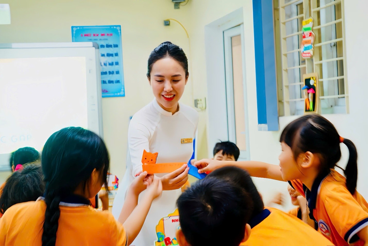 Đây là bức ảnh tôi chụp trong một tiết dạy chuyên đề với các em học sinh lớp 2A5 trường Tiểu học Đoàn Kết, quận Long Biên do tôi chủ nhiệm và giảng dạy. Tôi vẫn nhớ hôm đó là một tiết dạy học Toán với nội dung lồng ghép bài học STEM. Nhìn thấy khuôn mặt hứng khởi của các em trong tiết học với những hoạt động vận dụng kiến thức đã học để thực hành thiết kế ra các sản phẩm, tôi thực sự thấy hạnh phúc và yêu nghề mình hơn.