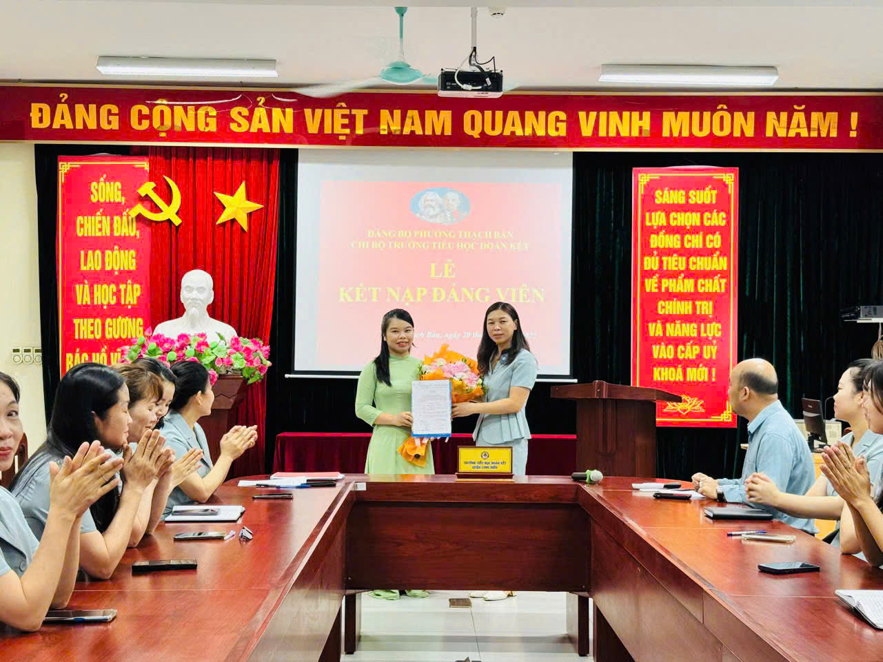 Được sự đồng ý của Quận ủy Long Biên, Đảng ủy phường Thạch Bàn, sáng ngày 20/6/2025, tại phòng Hội đồng sư phạm nhà trường, Chi bộ trường Tiểu học Đoàn Kết đã tổ chức Lễ kết nạp cho quần chúng ưu tú Trần Thị Ngọc Huyền vào hàng ngũ của Đảng Cộng sản Việt Nam. Lễ kết nạp được diễn ra trong không khí trang nghiêm, đúng trình tự với sự tham gia của đồng chí Nguyễn Thị Liễu – Bí thư Chi bộ, Hiệu trưởng nhà trường cùng toàn thể các đồng chí Đảng viên của Chi bộ trường Tiểu học Đoàn Kết.