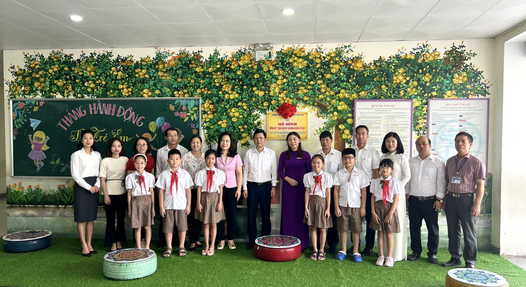 Kết thúc Hội nghị, các đồng chí lãnh đạo, đại biểu các cấp, BGH, đại diện CMHS, các em HS cùng tham gia gắn biển công trình chào mừng 20 năm thành lập quận Long Biên (06/11/2003- 06/11/2023) tại khu vực sân khấu nhà trường và thăm quan khung cảnh sư phạm trường học.