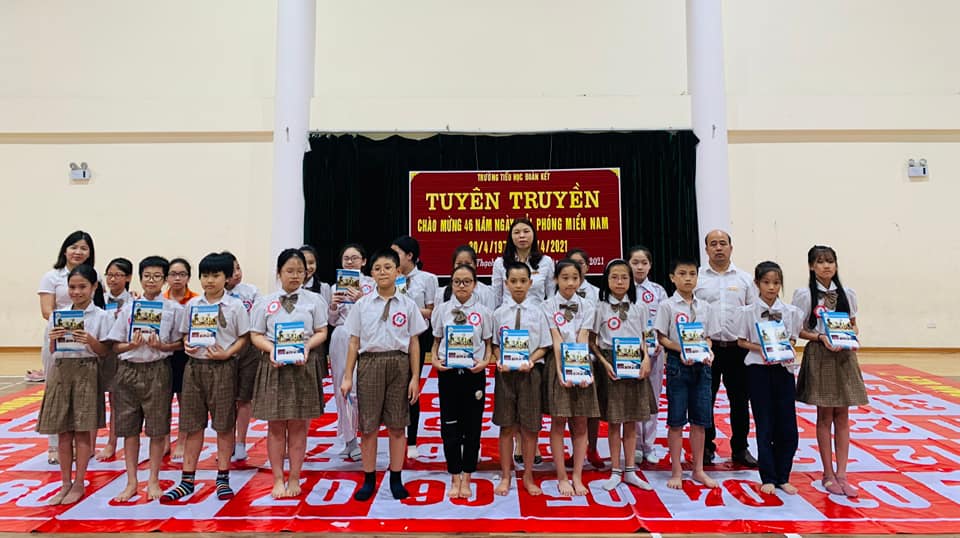 Nhằm giáo dục lòng tự hào dân tộc, tinh thần yêu nước, tìm hiểu những dữ kiện lịch sử quan trọng, những dấu mốc quan trọng, trong buổi sinh hoạt dưới cờ ngày 26/4/2021, liên đội trường Tiểu học Đoàn Kết tổ chức sân chơi “Rung chuông vàng” cho 48 em học sinh lớp 5 và trưng bày tranh với chủ đề “Ký ức ngày 30/4/1975” chào mừng 46 năm ngày giải phóng hoàn toàn miền Nam thống nhất đất nước (30/4/1975-30/4/2021). Với các câu hỏi đóng với 4 đáp án A, B, C, D thì các em học sinh đã được tìm hiểu nhiều nội dung, sự kiện, nhân vật, dấu mốc quan trong trong chiến dịch mùa xuân năm 1975 như: Vị tống thống cuối cùng của chính quyền Mỹ - Ngụy đầu hàng vô điều kiện khi quân ta chiếm dinh Độc Lập, phương châm bộ chính trị đưa ra trong kế hoạch giải phóng Miền Nam, chiếc xe tăng húc đổ cánh cổng dinh Độc Lập, người chiến sỹ cắm cờ trên nóc dinh Độc Lập trưa ngày 30/4/1975, các mũi tiến công của chiến dịch Hồ Chí Minh lịch sử, ý nghĩa lịch sử của chiến dịch…