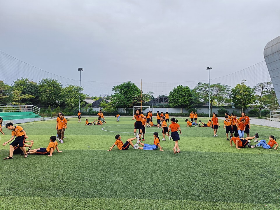 Các em chơi trò chơi Trồng hoa, trồng nụ tại sân bóng đá