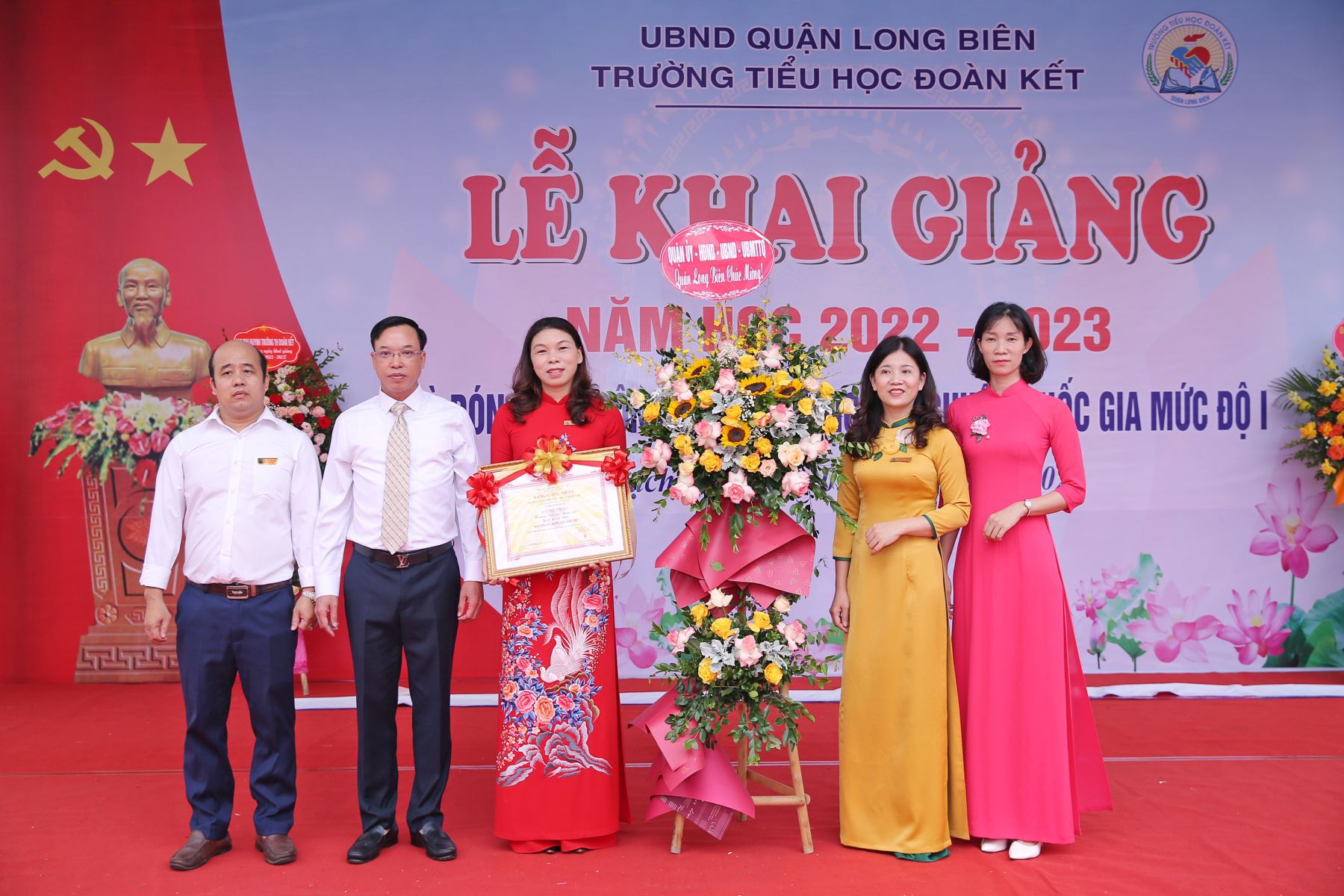 Tại buổi lễ, đồng chí Nguyễn Mạnh Hà- Phó Bí thư Quận ủy, Chủ tịch UBND Quận Long Biên đã tặng hoa chúc mừng, đánh trống khai trường và trao Bằng công nhận trường đạt chuẩn Quốc gia mức độ 1 cho thầy và trò nhà trường.