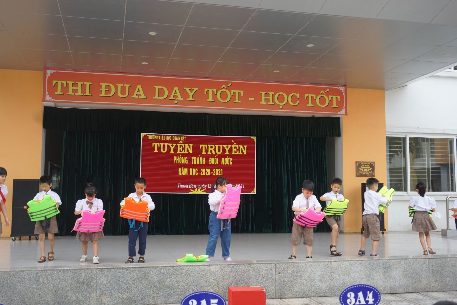 Đầu buổi tuyên truyền, thông qua câu hỏi thầy giáo Tổng phụ trách đã nhắc nhở các em học sinh không được đi bơi một mình, khi đi bơi lội phải có sự giám sát của người lớn; không được đi bơi ở ao, sông, hồ bởi chất lượng các nguồn nước thường hay bị ô nhiễm. Bên cạnh đó, khi các em bơi tại sông, hồ tiềm ẩn các yếu tố rủi ro cao như: mảnh chai, kim tiêm, cọc, hố sâu, nước soáy… Buổi tuyên truyền còn giúp các em biết cách mặc áo phao đúng cách. Thông qua cuộc thi mặc áo phao nhanh và đúng cách, việc mặc áo phao là biện pháp phòng tránh an toàn, hữu hiệu nhất khi tham các hoạt động dưới nước. Điểm mấu chốt trong buổi tuyên truyền được thầy giáo nhắc lại nhiều lần đó là các em học sinh tuyệt đối không được nhảy xuống cứu người bị đuối nước kể cả khi các em biết bơi. Khi nhìn thấy người bị đuối nước phải kêu to, cầu cứu sự hỗ trợ của người lớn. Các em còn được các thầy cô giáo hướng dẫn các cách xử lý khi gặp người đuối nước như: ném phao, ném vật nổi can nhựa, thùng nhựa, dùng sào dài, dùng dây có buộc vật nổ,…Biện pháp hiệu quả nhất đó là các em hãy đi học bơi đúng kĩ thuật, học các kĩ năng xuống nước an toàn. Với sự chuẩn bị kĩ lưỡng về đạo cụ, các em học sinh trực tiếp được thực hành trên sân khầu đã mang lại nhiều trải nghiệm bổ ích.