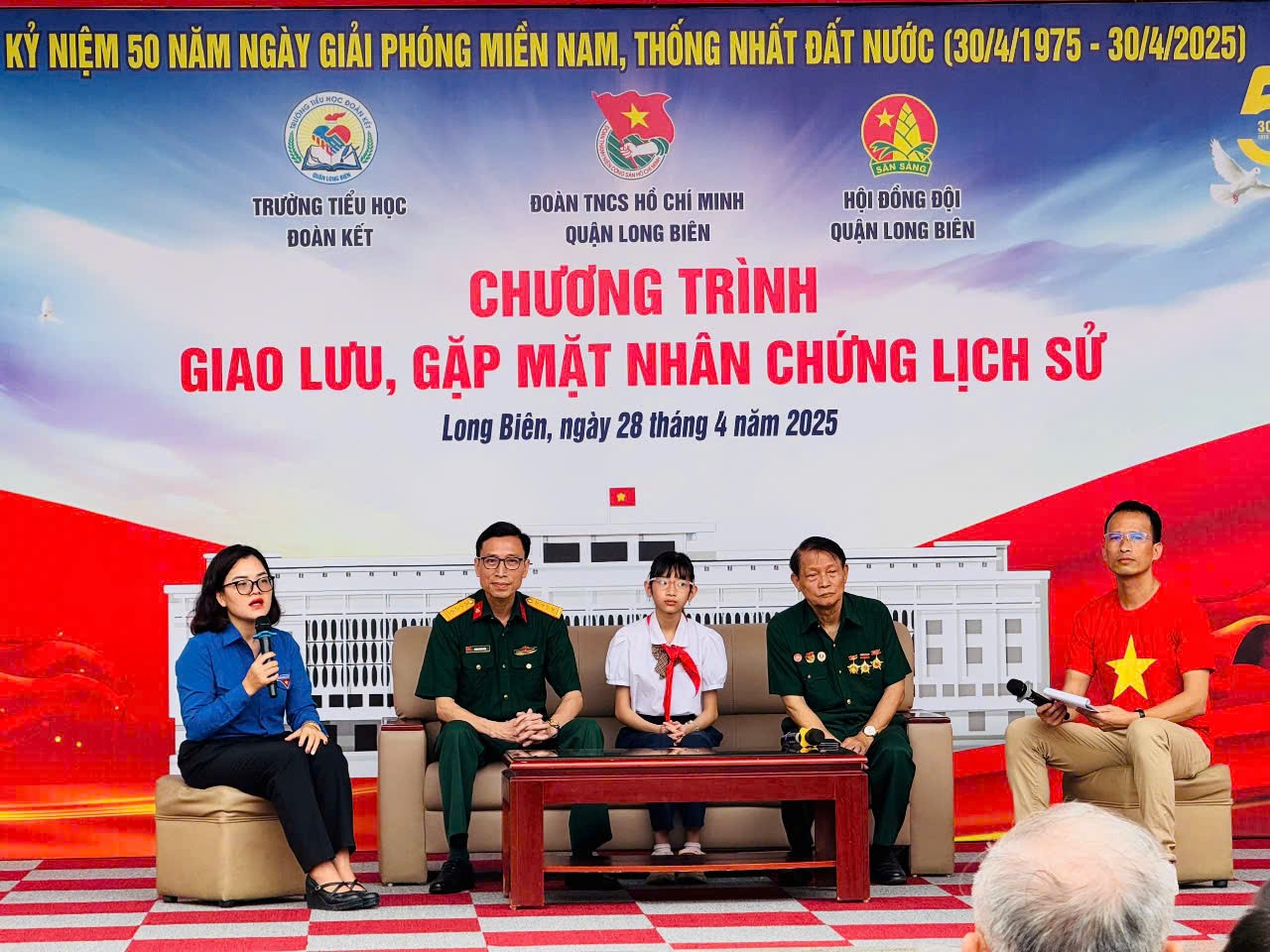 Sáng ngày 28/4/2025, tại sân trường Tiểu học Đoàn Kết, Quận đoàn – Hội đồng Đội quận Long Biên, Trường Tiểu học Đoàn Kết tổ chức chương trình giao lưu, gặp mặt nhân chứng lịch nhằm ôn lại những giá trị truyền thống, chiến thắng oanh liệt, vẻ vang, hào hùng của dân tộc và tri ân những người đã cống hiến, hy sinh vì nền độc lập, tự do của Tổ quốc, đồng thời giáo dục tình yêu quê hương đất nước, lòng tự hào dân tộc cho các em học sinh.