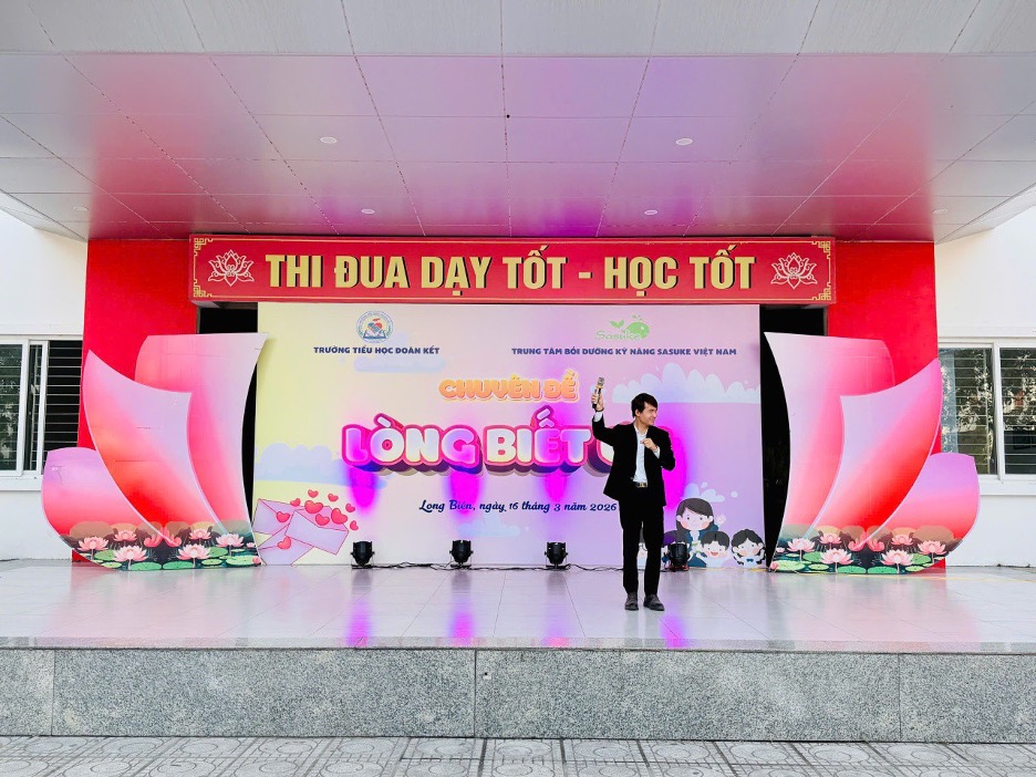 Nhằm giáo dục đạo đức, bồi dưỡng nhân cách và lan tỏa những giá trị sống tốt đẹp cho học sinh, sáng ngày 16/3/2026, tại sân trường, Trường Tiểu học Đoàn Kết đã phối hợp với Trung tâm Bồi dưỡng kỹ năng SASUKE Việt Nam tổ chức thành công chuyên đề kỹ năng sống với chủ đề “Lòng biết ơn” dành cho toàn thể học sinh trong nhà trường. Đến dự có các thầy cô giáo trong Ban giám hiệu nhà trường, các thầy cô giáo viên chủ nhiệm và các em học sinh.