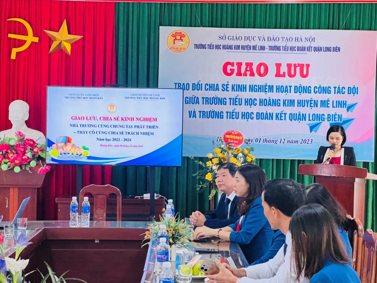 Thực hiện Kế hoạch số 4340/KH-SGDĐT ngày 12/12/2022 của Sở GDĐT Hà Nội về việc tổ chức phong trào "Nhà trường cùng chung tay phát triển - Thầy cô cùng sẻ chia trách nhiệm" giai đoạn 2023-2025. Chiều ngày 01/12/2023 Ban chỉ đạo triển khai thực hiện phong trào "Nhà trường cùng chung tay phát triển - Thầy cô cùng sẻ chia trách nhiệm" giai đoạn 2023-2025 cuả trường Tiểu học Đoàn Kết gồm các thầy cô giáo trong Ban giám hiệu nhà trường, các thầy cô giáo là tổ trường chuyên môn, đ/c Bí thư chi đoàn giáo viên, giáo viên làm TPT Đội do cô giáo Nguyễn Thị Liễu - Bí thư chi bộ, Hiệu trưởng nhà trường, trưởng Ban chỉ đạo đã có buổi tham quan, giao lưu, chia sẻ tại trường Tiểu học Hoàng Kim, huyện Mê Linh. Đoàn được đại diện nhà trường nhà trường đón tiếp chu đáo, đưa đi tham quan cơ sở vật chất, giới thiệu về tình hình giáo dục của địa phương, tình hình hoạt động của nhà trường; chia sẻ những khó khăn, thiếu thốn về đội ngũ, về cơ sở vật chất. Cũng tại đây, hai nhà trường đã cùng nhau trao đổi, chia sẻ những nội dung hoạt động công tác Đội và phong trào thiếu nhi của 2 nhà trường từ đầu năm học 2023-2024 đến nay, những mô hình triển khai hiệu quả có thể áp dụng vào thực tế trên tinh thần cởi mở, giao lưu, thân tình.