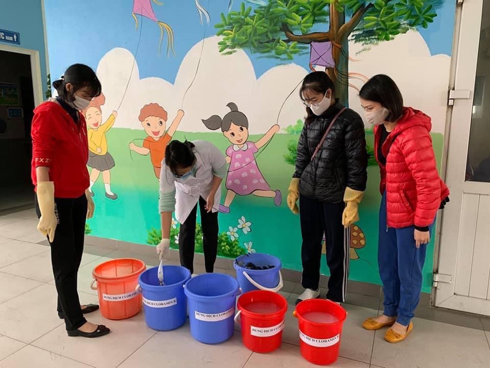 !important; Cùng tham gia tổng vệ sinh, khử khuẩn với tập thể cán bộ, giáo viên, nhân viên nhà trường còn có các bác phụ huynh của các lớp. Các công việc được thực hiện như quét dọn, lau nền nhà, cửa sổ, cửa ra vào, tay nắm cửa, tay vịn cầu thang, tay vịn lan can, bàn ghế, đồ chơi, dụng cụ học tập và các đồ vật trong phòng học, phòng chức năng bằng dung dịch sát khuẩn Cloramin B.