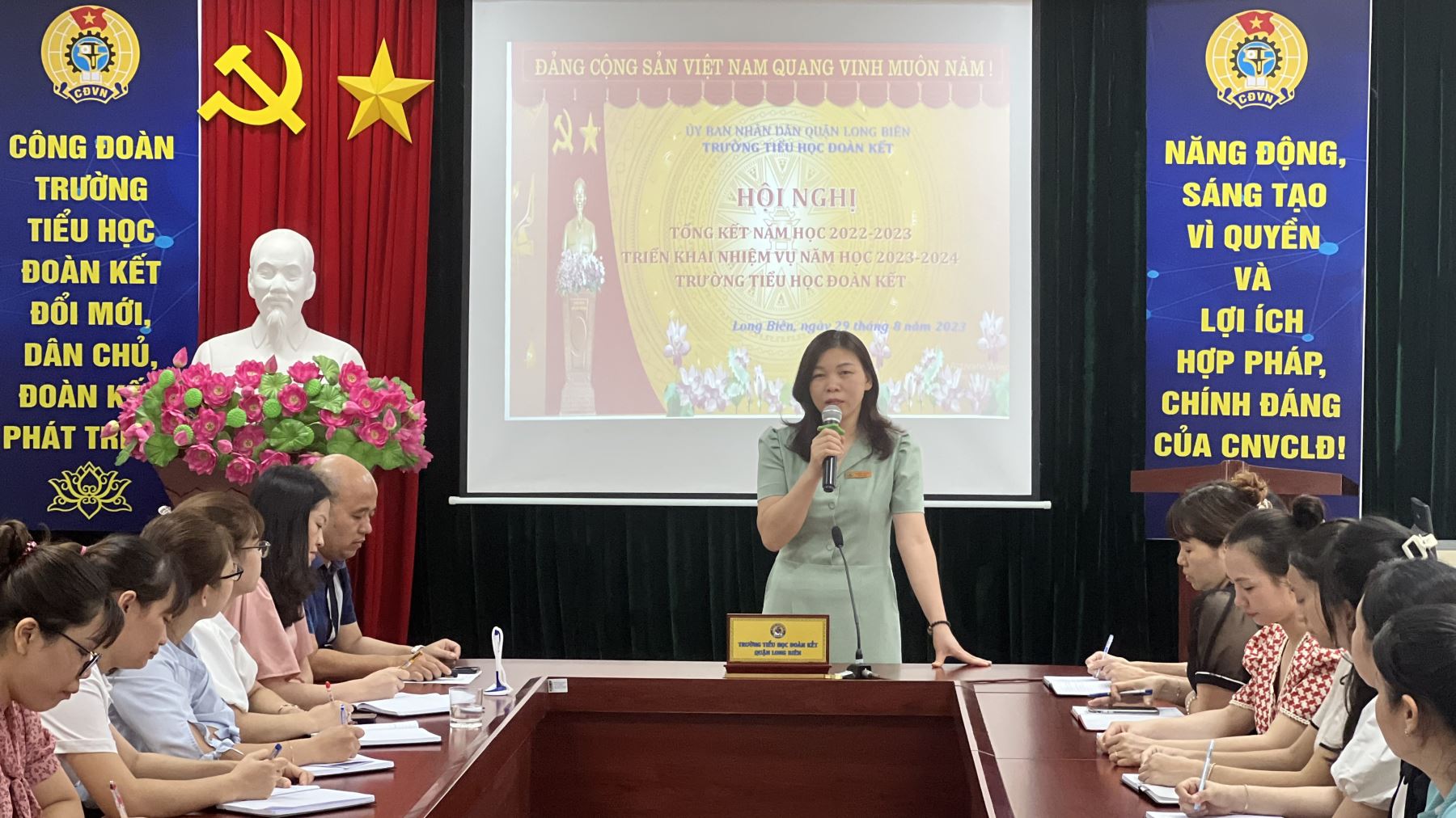 Chiều ngày 29/8/2023, tại phòng Hội đồng sư phạm, ban giám hiệu cùng tập thể cán bộ giáo viên nhân viên trường tiểu học Đoàn Kết tổ chức Hội nghị tổng kết năm học 2022-2023, triển khai nhiệm vụ năm học 2023-2024