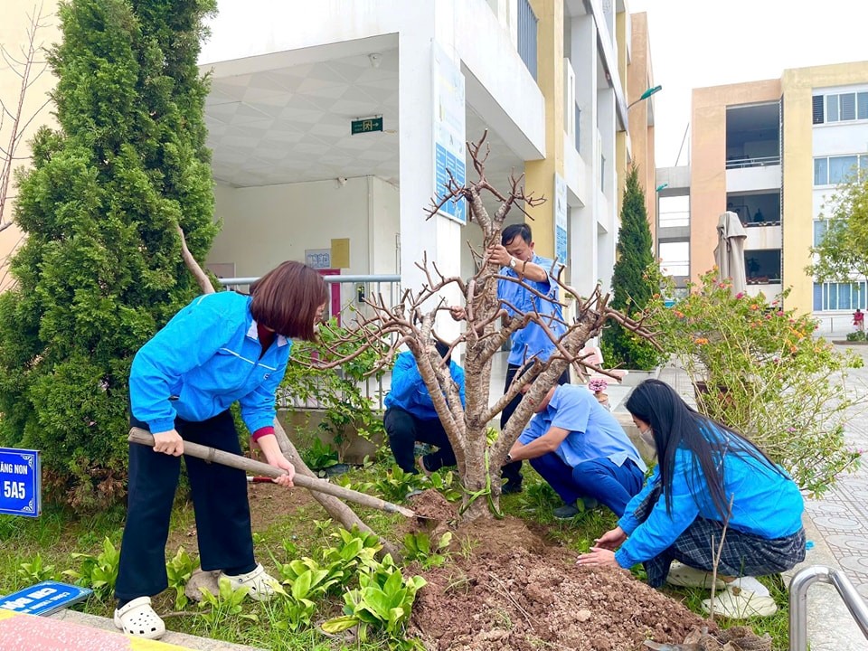 Chi đoàn giáo viên nhà trường là lực lượng nòng cốt cùng với các bác trong tổ bảo vệ trồng hai cây đào, quất tại đầu hồi dãy nhà B. Các em học sinh trong các chi đội hằng tuần được phân công tưới cây, chăm sóc. Đây là hoạt động thường niên của nhà trường cùng với Công đoàn thường xuyên trồng cây, hoa, chăm sóc, thay mới, chỉnh trang khung cảnh sư phạm nhà trường góp phần xây dựng nhà trường “Xanh - Sạch - Đẹp - Văn minh – Hạnh phúc”.
