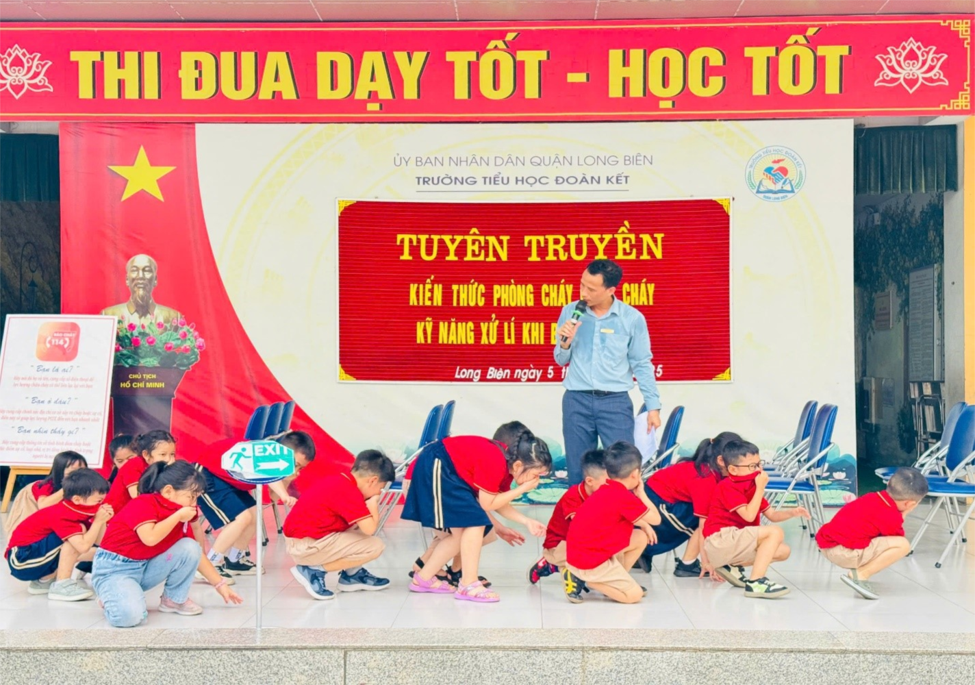 Ngày 13/4/2025 vụ cháy ở phường Trung Liệt, quận Đống Đa khiến người vợ và con trai tử vong. Vụ cháy toà nhà Parkson ở Thái Hà ngày 18/4/2025 may mắn không gây thiệt hại vè người nhưng để lại hậu quả, thiệt hại to lớn về vật chất. Sáng 22/4/2025 xảy ra cháy ngay gần gần Trường Tiểu học Thăng Long, Hoàn Kiếm khiến 100 học sinh phải sơ tán. Gần đây nhất ngày 28/4/2025, vụ cháy nhà trên phố Định Công Hạ làm 3 người tử vong. Đặc biệt vụ cháy chung cư mi ni ở phường Khương Đình, Thanh Xuân làm 56 người chết tháng hồi 9/2023 vẫn còn làm cho chúng ta ám ảnh. Thực hiện Kế hoạch số 72/PGDĐT ngày 22/4/2025 của Phòng GD&ĐT quận Long Biên về việc tăng cường công tác tuyên truyền giáo dục phòng cháy, chữa cháy và cứu nạn cứu hộ trong trường học, với mong muốn trang bị kiến thức, kĩ năng cho các em học sinh, sáng ngày 05/5/2025 tại sân trường, Liên đội Trường Tiểu học Đoàn Kết tổ chức tuyên truyền kiến thức phòng cháy, chữa cháy; kĩ năng thoát hiểm cho các em học sinh.