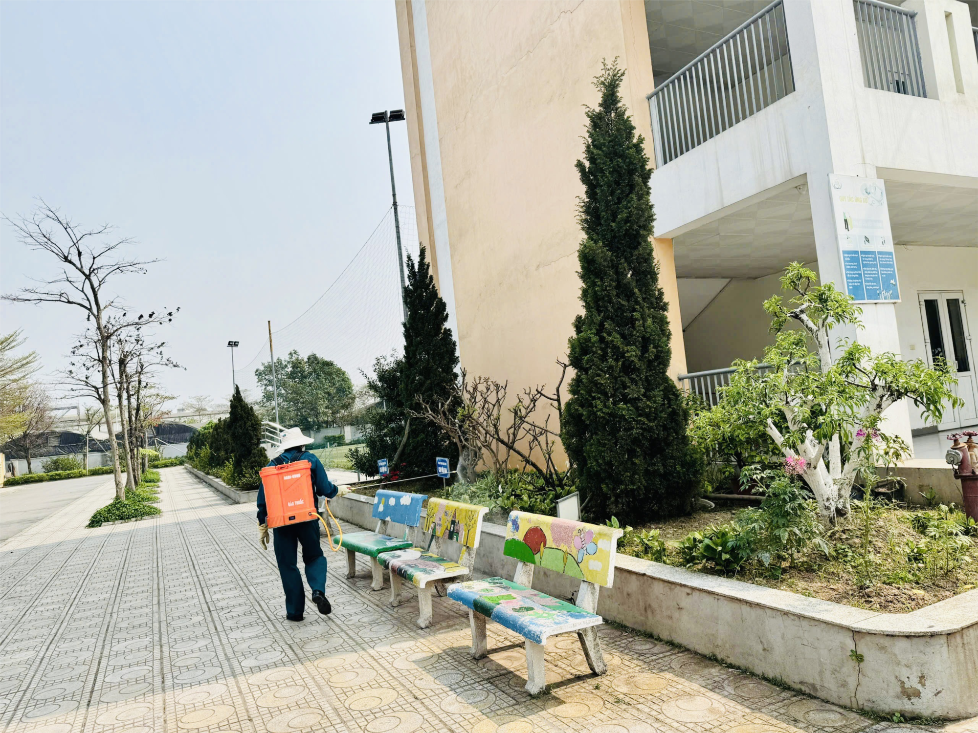 Việc vệ sinh, phun thuốc khử khuẩn được nhà trường tổ chức nào ngày 22/3/2025, là ngày nghỉ cuối tuần để đảm bảo an toàn cho học sinh trong quá trình phun thuốc, đồng thời bộ phận vệ sinh có thời gian lau dọn sau phun. Dưới sự giám sát của bộ phận y tế nhà trường, toàn bộ các dãy nhà, phòng học, hành lang, khu nhà vệ sinh, các bồn hoa, góc khuất, cống rãnh, … đều được phun thuốc khử khuẩn. Đây cũng là hoạt động thường niên của nhà trường được triển khai 2-3 lần/năm vào các thời điểm chuẩn bị năm học mới, giao mùa, thời tiết ẩm thấp, muỗi dễ sinh sôi, nảy nở.