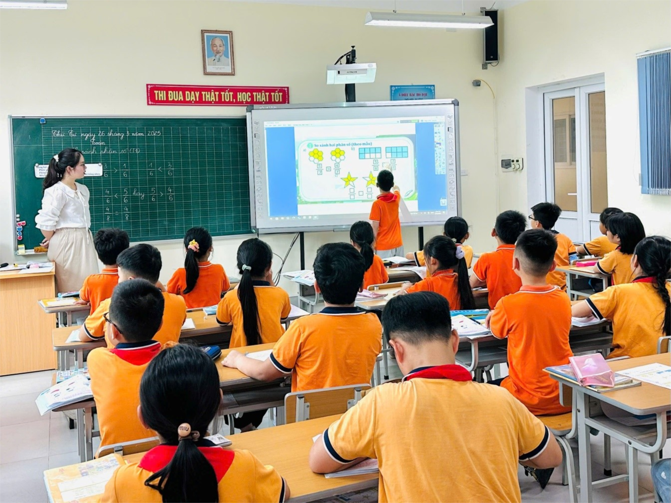 Trong cuộc cách mạng công nghiệp 4.0, công nghệ ngày càng trở thành một phần không thể thiếu trong công tác giảng dạy. Chiều ngày 26/3/2025, cô giáo Hồ Thuý Hoa cùng các em học sinh lớp 4A5 đã thực hiện chuyên đề Toán 4 - Bài 58: So sánh phân số (tiết 1) sử dụng bảng tương tác thông minh giúp các giáo viên trong tổ khối nâng cao kỹ năng ứng dụng công nghệ trong giảng dạy và giúp học sinh hiểu rõ hơn về cách so sánh hai phân số có cùng mẫu số.