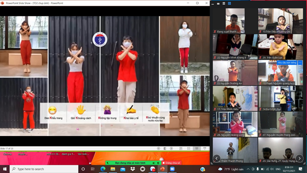 Giáo dục thể chất là một môn học rất đặc thù. Khác với các môn học khác đã có tài liệu cứng, nội dung quen thuộc..., môn giáo dục thể chất còn rất xa lạ với khái niệm học trực tuyến. Song để đảm bảo chương trình giảng dạy môn học đạt được hiệu quả tốt nhất, khi chuyển sang hình thức dạy học online, các đồng chí giáo viên trong nhóm thể dục đều phải có kĩ năng sử dụng sử dụng công nghệ thông tin và không ngừng tự bồi dưỡng nâng cao ứng dụng các phần mềm phục vụ cho công tác giảng dạy như Zoom, Azota, Olm,... Để thích nghi với tình hình mới, các giáo viên trong nhóm đã thống nhất thay đổi, chủ động xây dựng kế hoạch chương trình phù hợp với dạy trực tuyến, quay video clip bài giảng rõ hình, rõ tiếng, hướng dẫn từng động tác các bài tập phục vụ hiệu quả cho HS tập luyện. Ngoài ra, mỗi giáo viên tổ chức dạy học trực tuyến qua phần mềm Zoom cũng xen kẽ các bài giảng Powpoint hình ảnh bắt mắt, sinh động, âm thanh rõ ràng thu hút sự tập trung của học sinh. Trong giờ học không nhất thiết lúc nào cũng phải theo khuôn khổ mà phải luôn linh động để có sự thay đổi nhằm tạo cho học sinh hứng thú, yêu thích tập luyện. Giáo viên đã đưa một số bài hát hay bài nhảy dân vũ kết hợp trên nền nhạc sôi động vui tươi phù hợp với lứa tuổi học sinh vào phần khởi động để học sinh thêm hào hứng khi bước vào tiết học. Ôn lại nội dung bài cũ có thể thực hiện theo ứng dụng vòng quay chọn tên học sinh thực hiện (ứng dụng wheelofnames). Phần thả lỏng có thể thay bằng trò chơi đơn giản hay bài hát múa nhẹ nhàng để học sinh không cảm thấy nhàm chán. Kết hợp các bài tập thể lực trong tiết học phù hợp với đối tượng học sinh để các em rèn luyện sức khỏe, tăng cường sức đề kháng để phòng chống dịch.