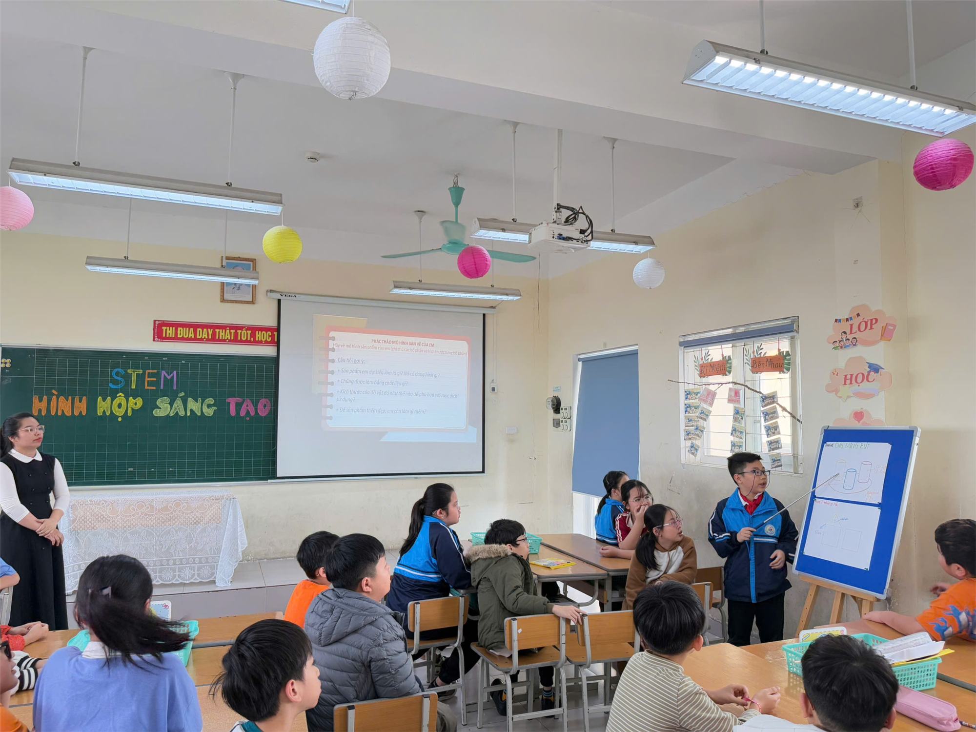 Trong chương trình giáo dục phổ thông 2018, STEM vừa mang ý nghĩa thúc đẩy các lĩnh vực khoa học, công nghệ, toán học, kĩ thuật vừa thể hiện phương pháp tiếp cận liên môn, phát triển năng lực, phẩm chất của người học. STEM chính là sự điều chỉnh kịp thời của giáo dục phổ thông trước cuộc cách mạng công nghệ 4.0. Dưới sự chỉ đạo của Ban giám hiệu nhà trường, giáo viên khối 5 đã xây dựng tiết dạy bài học STEM Toán 5 “Hình hộp sáng tạo”. Tiết dạy do cô giáo Trần Thị Ngọc Huyền và các em học sinh lớp 5A3 thực hiện.