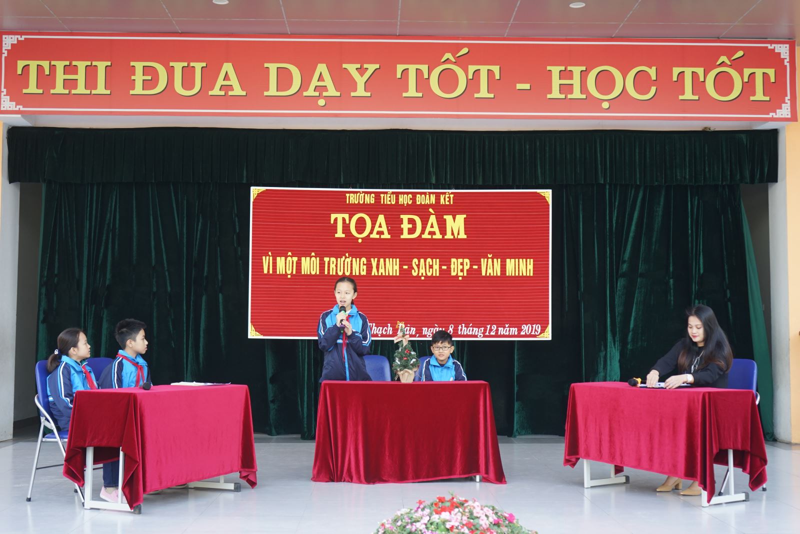 Sáng ngày 9/12/2019, Liên đội Tiểu học Đoàn Kết đã tổ chức buổi tọa đàm giúp cho các đội viên, thiếu niên nhi đồng toàn liên đội có một cái nhìn toàn diện về thực trạng và các giải pháp nhằm cải thiện môi trường sống. Buổi tọa đàm tập trung thảo luận về các vấn đề giữ gìn vệ sinh môi trường, hạn chế rác thải, tiếng ồn, biến đổi khí hậu,… nhằm hướng tới mục tiêu “Vì môi trường Xanh - Sạch - Đẹp - Văn minh”.