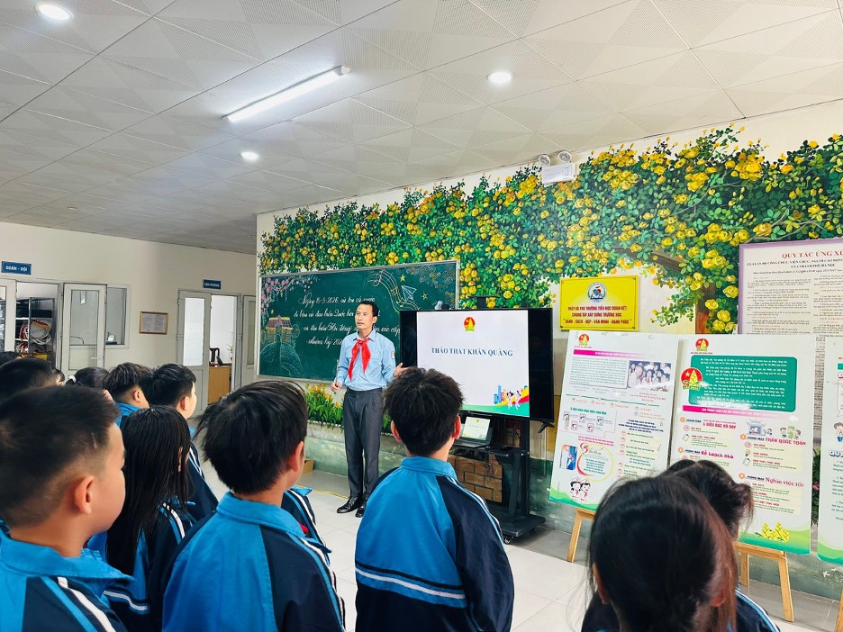 Bên cạnh việc truyền đạt kiến thức, thầy giáo Tổng phụ trách Đội còn hướng dẫn thực hành tháo, thắt khăn quàng đỏ qua đó, học sinh không chỉ nắm vững kiến thức mà còn có kĩ năng thực hiện tốt các yêu cầu đối với Đội viên từ đó tự hào khi được đứng trong hàng ngũ của Đội TNTP Hồ Chí Minh.