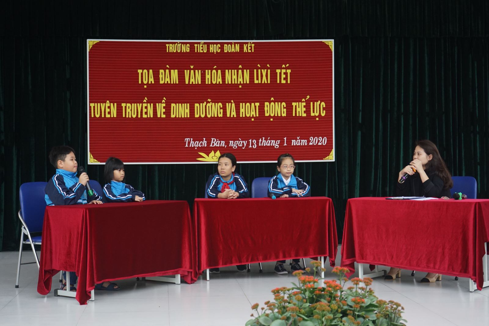 Tuy nhiên để các em hiểu rõ hơn về nét đẹp văn hóa của lì xì ngày Tết, ngày 13/1/2020, Liên đội Tiểu học Đoàn Kết tổ chức buổi tọa đàm “Văn hóa nhận lì xì ngày Tết”. Tham dự buổi tọa đàm ngày hôm nay có các cô giáo trong Ban giám hiệu cùng các thầy cô giáo và toàn thể 1094 em học sinh của nhà trường. Đặc biệt là sự góp mặt của 4 em học sinh với vai trò khách mời lên chia sẻ, nói lên quan điểm của bản thân về nét đẹp văn hóa nhận lì xì ngày Tết cùng với cô tổng phụ trách.