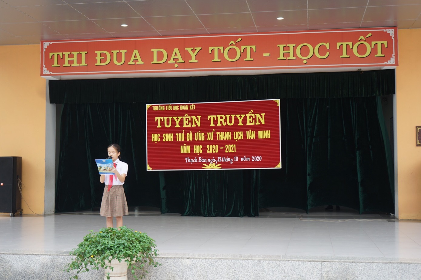 Thực hiện Kế hoạch số 335/KH-UBND ngà !important;y 20/9/2020 của Ủy ban nhân dân quận Long Biên về việc ban hành kế hoạch thực hiện Đề án “Xây dựng văn hóa ứng xử trong trường học giai đoạn 2020-2025”; trong không khí người dân Thủ đô Hà Nội kỷ niệm 1010 năm Thăng Long- Hà Nội; chào mừng 66 năm ngày Giải phóng Thủ đô (10/10/1954-10/10/2020); sáng ngày 12/10/2020 tại sân trường, Liên đội trường Tiểu học Đoàn Kết tổ chức Giáo dục chuyên đề “Học sinh Thủ đô ứng xử thanh lịch, văn minh”. Buổi tuyên truyền nhằm giúp các em có những lời nói, cử chỉ, hành động đẹp, nhân văn xứng đáng là Thiếu nhi Thủ đô Hà Nội.